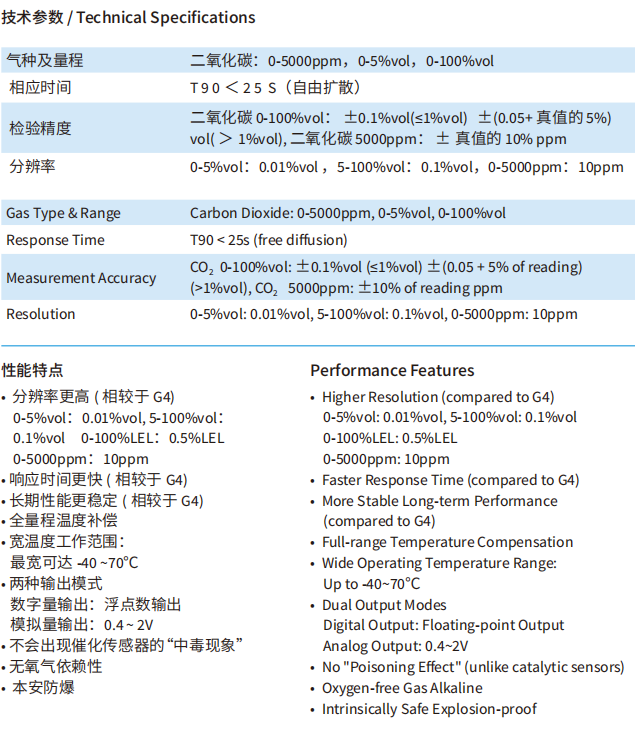 The G4(P) series infrared gas sensor is an intelligent micro gas sensor designed based on the NDIR (Non-Dispersive Infrared) principle. It measures gas concentration by utilizing the absorption characteristics of gases at specific infrared wavelengths. Featuring a dual-wavelength optical path design, it operates without oxygen dependency and is immune to the poisoning effect common in catalytic sensors, offering long service life, high accuracy, and stable performance.This sensor provides both analog and digital signal output interfaces, delivering pre-linearized and temperature-compensated gas concentration values for immediate use, ensuring superior user convenience.